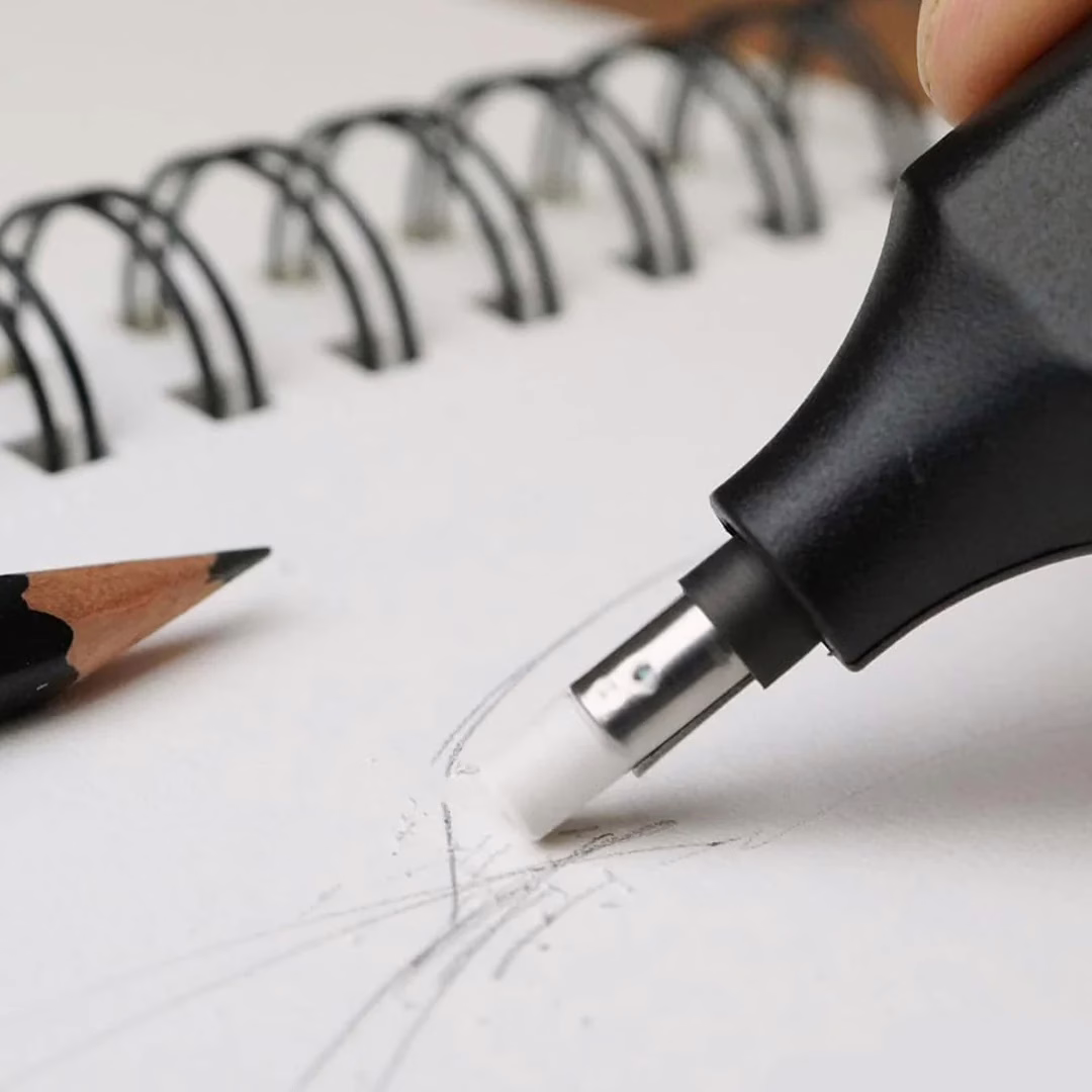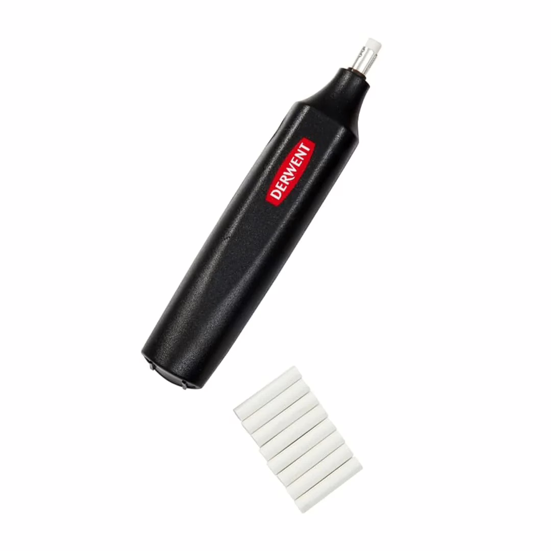 Eleva tu técnica de dibujo con una herramienta diseñada para el detalle extremo. El borrador eléctrico de Derwent ofrece un control y una velocidad que las gomas convencionales no pueden alcanzar, permitiéndote rescatar blancos y crear efectos de luz con una limpieza absoluta.